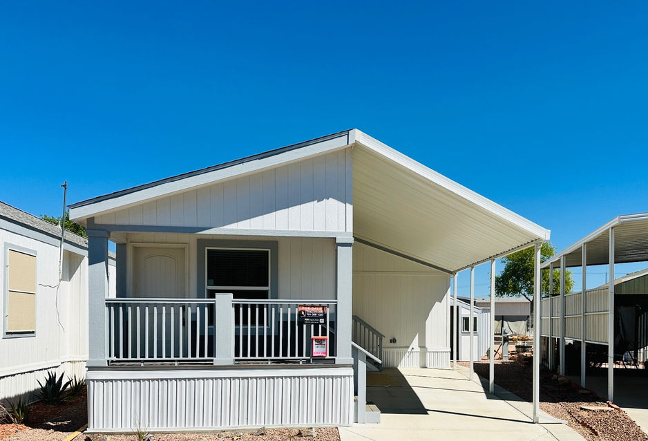 Now available in Shiprock 55+ Resort, this brand new 2025 Cavco Villa offers modern resort-style living with spectacular, unobstructed views of the Superstition Mountains. Perfectly positioned on a premium lot, this multi-section home combines comfort, efficiency, and outdoor lifestyle in one of Apache Junction's most desirable gated communities. This thoughtfully designed home features an open kitchen with stainless steel appliances including a refrigerator, dishwasher, oven/range, and microwave. The layout flows easily into the dining and living areas with durable vinyl plank flooring throughout. The primary bedroom includes a private en suite bath, and a second full bathroom serves guests or the second bedroom with ease. A dedicated closet houses a stackable washer and dryer for efficient in-home laundry without sacrificing space. Outside, enjoy a newly poured concrete driveway, an extended awning for shaded relaxation, and a brand new shed with a window-perfect for extra storage or workspace. With panoramic scenic, park, and city views in addition to the breathtaking Superstition Mountain backdrop, this home offers one of the best locations in the community. The monthly land lease is just $500, giving you access to all of Shiprock's resort-style amenities including a pool, spa, clubhouse, fitness center, golf, recreation room, and more. Whether you're a seasonal snowbird or seeking full-time comfort in a vibrant, friendly 55+ neighborhood, this brand new Villa is a must-see. #ShiprockResort #CavcoVilla #NewHomeListing #SuperstitionMountainViews #55PlusLiving #ApacheJunctionAZ #ArizonaRetirement #MesaSnowbirds #AffordableLuxury #ActiveAdultCommunity #SnowbirdLifestyle
