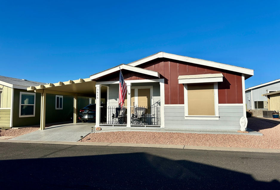 Welcome to effortless, active 55+ living in ViewPoint RV and Golf Resort, one of Mesa's most desirable gated golf communities. This beautifully refreshed 2017 Cavco multi-section home offers 1,056 square feet of comfortable, well-designed living space with 2 bedrooms and 2 full baths, perfectly positioned on a premium ground-set lot with scenic and city views. The open kitchen flows into the dining and living areas, creating a bright and inviting layout ideal for entertaining or relaxed everyday living. Recent 2025 improvements include fresh interior and exterior paint, refinished cabinetry, new bathroom flooring, and a new water heater. Luxury vinyl tile flooring enhances the main living areas, while carpeted bedrooms provide warmth and comfort. The split bedroom floor plan offers privacy for guests, and the primary suite features a private en-suite bath. An in-home laundry room adds everyday convenience. Outdoor features elevate this home's appeal with a brand-new coated driveway, covered porch, patio, updated deck railings, exterior sun screens, and a full carport. A large shed/workshop with French doors and a window provides exceptional storage or hobby space, complemented by added storage and a whole-home water softener. Residents of ViewPoint enjoy resort-style amenities including championship golf, multiple pools, fitness center, tennis courts, clubhouse, recreation rooms, organized activities, security, and gated access - all within a pet-friendly 55+ community. Municipal water and sewer are included, and the location offers convenient access to public transportation. Land lease is paid semiannually (not monthly). County taxes are approximately $219 annually. This home delivers turnkey comfort, an active lifestyle, and exceptional value in one of Mesa's premier active adult golf resorts. #ViewPointGolfResort #MesaAZ #MesaSnowbirds #AZ55PlusLiving #DragonflyHomesByMindy #MindyKnowsMobiles #CavcoHomes #ManufacturedHomeLiving #ActiveAdultLifestyle #ArizonaRetirement #ResortStyleLiving #GolfCommunity #55PlusHomes